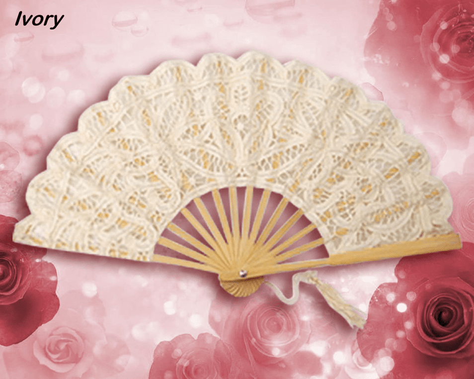 - Ivory lace fan with natural frame measures 8.5" long x 15.5" wide (when fully opened)